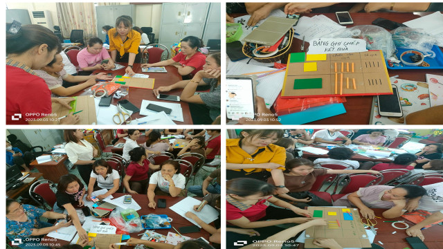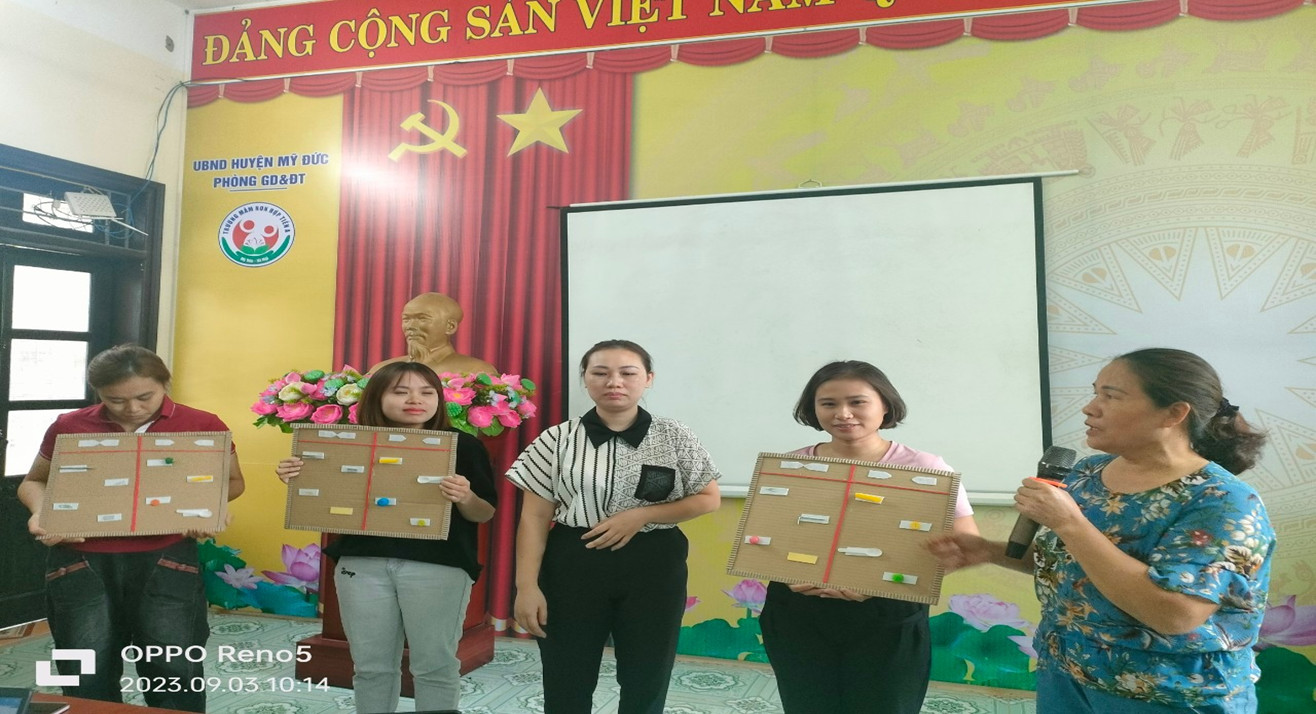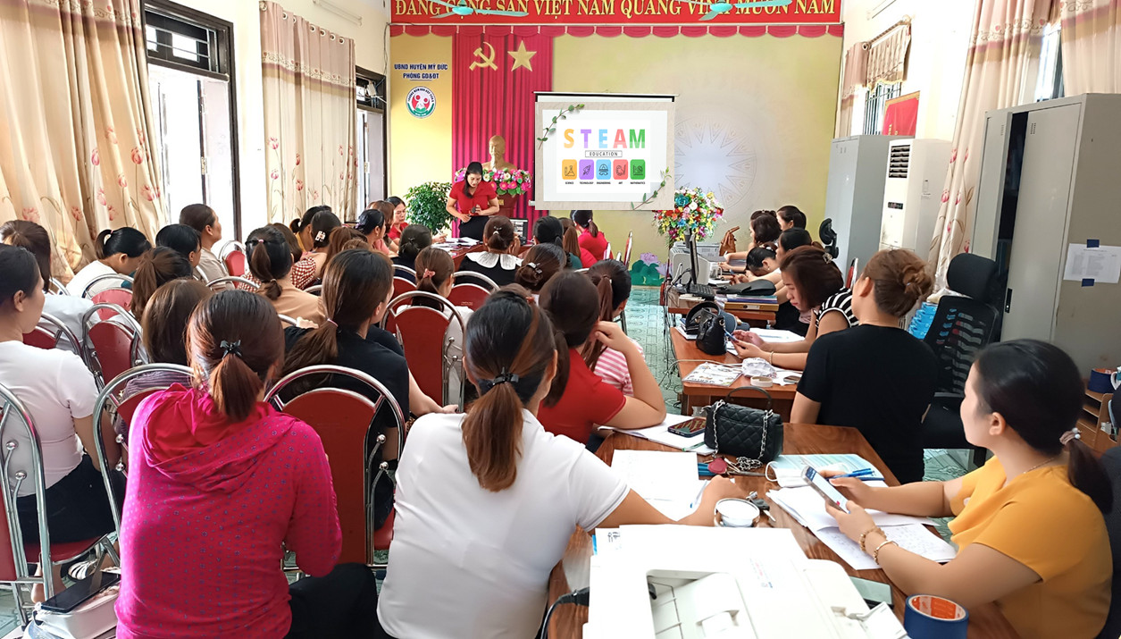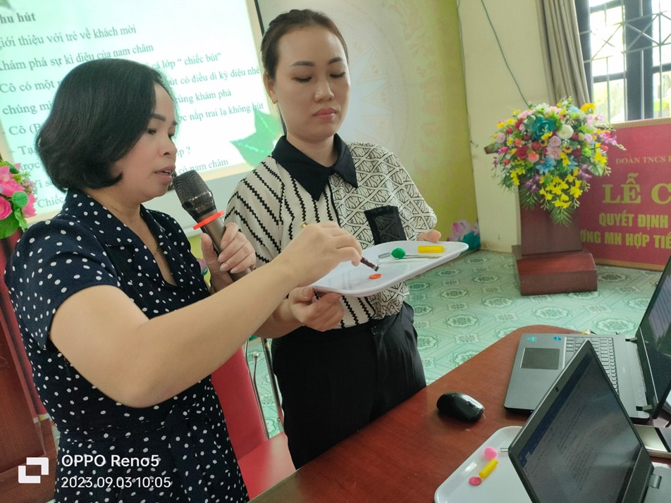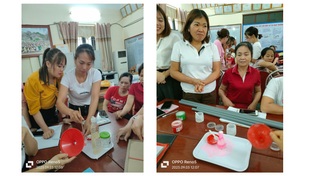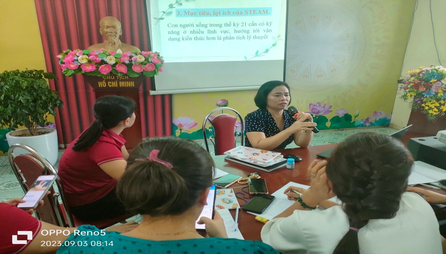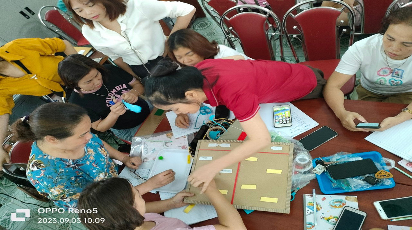 13/09/2023 A- A A+ | Chuyên đề bồi dưỡng phương pháp giáo dục tiên tiến STEAM cho giáo viên Xem Chia s? THỰC HIỆN CHUYÊN ĐỀ BỒI DƯỠNG PHƯƠNG PHÁP GIÁO DỤC TIẾN TIẾN STEAM CHO GIÁO VIÊN Để đáp ứng với nhu cầu nâng cao trình độ chuyên môn nghiệp vụ cho các đồng chí giáo viên và nâng cao chất lượng chăm sóc, giáo dục trẻ "lấy trẻ làm trung tâm" và áp dụng phương pháp tiên tiến STEAM để trẻ được quan sát, trải nghiệm, thực hành và rút ra bài học thông qua việc khám phá, trải nghiệm.... từ đó trẻ tư duy, sáng tạo và có kiến thức kỹ năng, thái độ đối với sự vật hiện tượng xung quanh trẻ. Nhận thức được tầm quan trọng của phương pháp giáo dục tiên tiến STEAM. Hôm nay tổ chuyên môn đã tổ chức sinh hoạt chuyên môn cho các đồng chí giáo viên với nội dung "Ứng dụng phương pháp STEAM vào các hoạt động cho trẻ" trong trường mầm non. Về dự với buổi sinh hoạt chuyên môn đặc biệt có Đ/C Bùi Thị Thanh Phương Hiệu trưởng nhà trường, Đ/C Đặng Thị Điểm Phó hiệu trưởng nhà trường cùng các đồng chí giáo viên trong các tổ khối đã thực hành, khám phá, trải nghiệm với phương pháp giáo dục tiên tiến thực tế lấy cô làm trẻ để đưa ra các biện pháp giáo dục phù hợp với đặc điểm của trẻ tại trường mầm non Hợp Tiến A và cũng qua đó kích thích giáo viên sáng tạo linh hoạt trong công tác chăm sóc và giáo dục trẻ để chất lượng giáo dục đạt hiệu quả cao. Tập tin đính kèm Tải về