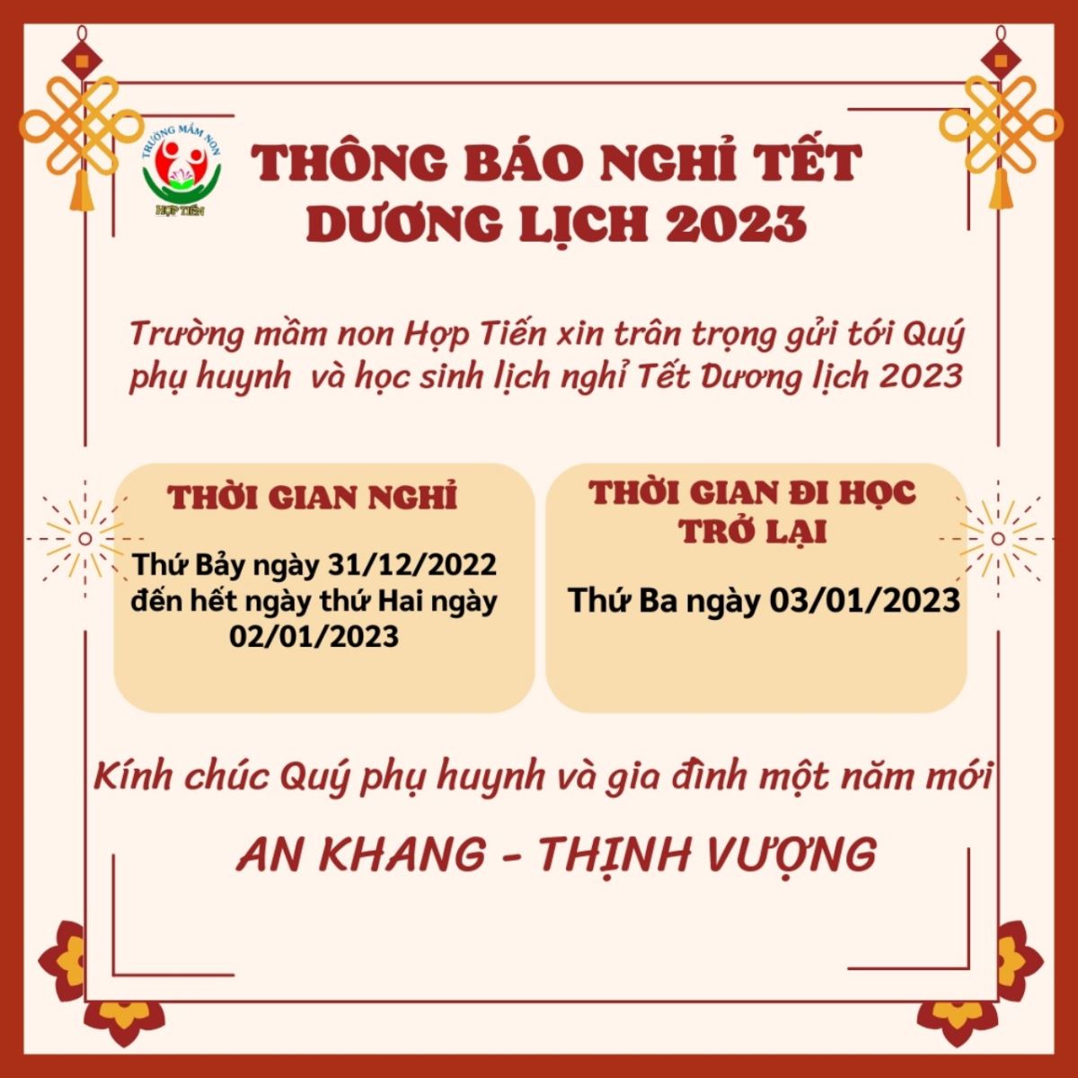30/12/2022 A- A A+ | THÔNG BÁO LỊCH NGHỈ TẾT DƯƠNG LỊCH NĂM 2023 Xem Chia s? Kính gửi các quý phụ huynh học sinh Thực hiện công văn số 4310/SGDĐT-VP ngày 07/12/2022 của sở giáo dục và đào tạo về việc nghỉ tết dương lích năm 2023. trường mầm non Hợp Tiến xin thông báo nghỉ như sau: Tập tin đính kèm Tải về