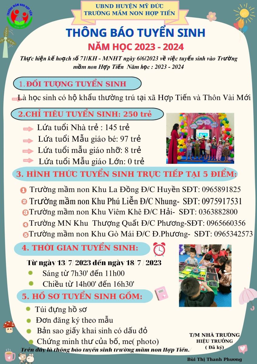 03/07/2023 A- A A+ | THÔNG BÁO TUYỂN SINH NĂM HỌC: 2023 - 2024 Xem Chia s? Căn cứ Kế hoạch số 309/KH-PGD&ĐT ngày 11/5/2023 của Phòng GD&ĐT Mỹ Đức về kế hoạch tuyển sinh vào các trường mầm non, lớp 1 và lớp 6 năm học 2023-2024 trên địa bàn huyện Mỹ Đức Thực hiện kế hoạch số 71/KH - MNHT ngày 6/6/2023 về việc tuyển sinh vào Trường mầm non Hợp Tiến Năm học : 2023 - 2024 Tập tin đính kèm Tải về