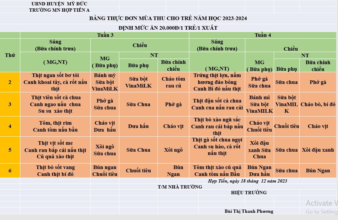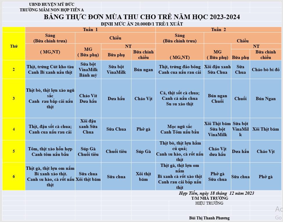 THỰC ĐƠN THÁNG 11 TUẦN I VÀ TUẦN II TRƯỜNG MẦM NON HỢP TIẾN A