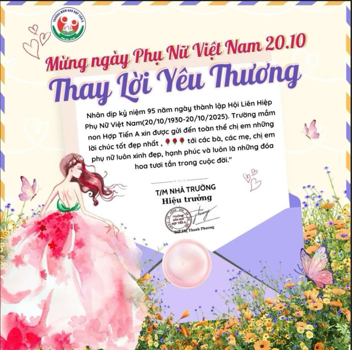20/10/2025 A- A A+ | TRƯỜNG MẦM NON HỢP TIẾN A CHÀO MỪNG KỶ NIỆM 95 NĂM NGÀY THÀNH LẬP HỘI LIÊN HIỆP PHỤ NỮ VIỆT NAM Xem Chia s? 🎉✨ TRƯỜNG MẦM NON HỢP TIẾN A CHÚC MỪNG NGÀY PHỤ NỮ VIỆT NAM 20/10 ✨🎉 💐 Hòa trong không khí rộn ràng, tươi vui của cả nước hướng về Ngày Thành Lập Hội Liên Hiệp Phụ nữ Việt Nam 20/10, Trường Mầm non Hợp Tiến A xin gửi tới quý phụ huynh – các bà, các mẹ – cùng toàn thể cán bộ, giáo viên, nhân viên nữ của nhà trường những lời chúc mừng nồng nhiệt và tốt đẹp nhất! 🌸 💖 20/10 là dịp đặc biệt để tôn vinh những người phụ nữ Việt Nam đảm đang, dịu dàng, giàu đức hy sinh, luôn lặng lẽ dành trọn yêu thương, vun vén hạnh phúc cho gia đình và nuôi dưỡng những mầm xanh tương lai. 🌿 👩🏫 Đặc biệt, xin gửi lời tri ân sâu sắc đến các cô giáo Trường Mầm non Hợp Tiến A – những “người mẹ hiền thứ hai” của các bé. Các cô luôn tận tâm chăm sóc, dạy dỗ và gieo vào tâm hồn trẻ thơ những hạt mầm yêu thương, nhân ái, góp phần xây dựng nên môi trường giáo dục thân thiện – hạnh phúc – tràn đầy tiếng cười. 🌷 🌹 Nhân ngày đặc biệt này, kính chúc quý phụ huynh – các bà, các mẹ – cùng toàn thể nữ cán bộ, giáo viên, nhân viên nhà trường: ✨ Luôn mạnh khỏe – xinh đẹp – hạnh phúc – thành công, ✨ Mỗi ngày đều tràn ngập niềm vui, năng lượng và yêu thương bên gia đình, con trẻ và đồng nghiệp! 💕 🏫 Xin chúc Trường Mầm non Hợp Tiến A luôn là ngôi nhà chung tràn đầy năng lượng tích cực, nơi mỗi cô giáo, mỗi em nhỏ đều cảm nhận được tình yêu thương và sự sẻ chia ấm áp! 🌈 💐 Chúc mừng Ngày Phụ nữ Việt Nam 20/10! Hãy cùng lan tỏa những điều tốt đẹp và yêu thương trong ngày ý nghĩa này nhé! 💕🌸 #TruongMamNonHopTienA#PhuNuVietNam2010 #YeuThuongVaTronVen Tập tin đính kèm Tải về